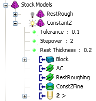 在以下示例中,“毛坯”、“AC”和“残留粗加工”是经过计算的残留模型状态。因此,如果对“毛坯”残留模型状态使用“之后应用刀具”选项,则会使“AC”和“残留粗加工”残留模型状态无效。