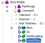 在以下示例中,“毛坯”、“AC”和“残留粗加工”是经过计算的残留模型状态。因此,如果对“毛坯”残留模型状态使用“之后应用刀具”选项,则会使“AC”和“残留粗加工”残留模型状态无效。
