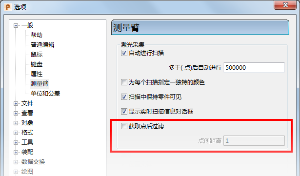 使用“选项”对话框的“测量臂”页面上的“获取点后过滤”选项可在扫描期间过滤点。