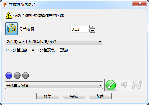 使用“实体诊断器愈合”对话框可愈合或放松实体操作失败的区域。