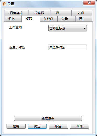 使用“位置”对话框的“法向”选项卡输入一个与对话框上显示的工作空间原点处的对象垂直的位置。