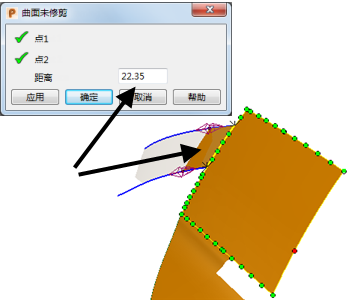 - 在对话框中输入“距离”。“距离”是沿延长曲面测量的实际距离,而不是投影距离。