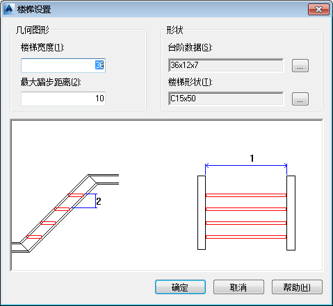 设置楼梯的几何图形设置。括号内指明的数值与预览图像中位号的几何图形相对应。