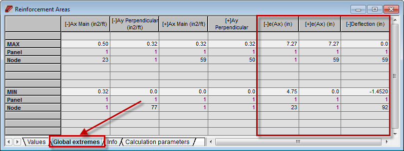 The [-]e(Ax), [+]e(Ax) and [-] Deflection columns are added to the Reinforcement Areas table.