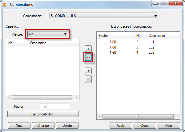 to transfer all the live load cases from the left panel to the list of cases in combination in the right panel.
