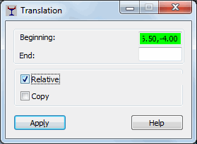 Define the translation vector either graphically or by entering the vector coordinates in the Translation dialog. If Relative is selected, coordinates of the translation vector end are calculated with respect to the position of the beginning point of the translation vector. If this option is cleared, coordinates of both points defining the translation vector are given in the adopted coordinate system.