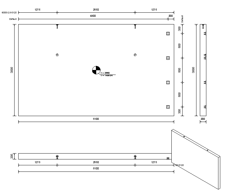 在俯视图和前视图中,仅会对板(无锚固件)进行尺寸标注,因为在这些视图中仅锚固件的圆形面可见,从而不会为尺寸标注提供任何参照。