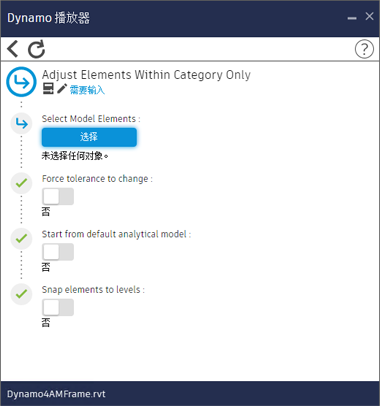 调整块时会显示警告窗口。交付的 Dynamo 脚本中包含四个调整块;因此,如果每个块试图对不支持的图元操作,可能会显示四个警告窗口。警告窗口并不会阻止或停止对整个脚本进行处理。