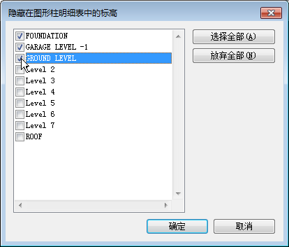 将打开“隐藏在图形柱明细表中的标高”对话框并列出该项目中的所有标高。