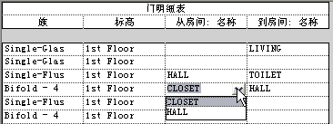 此时门明细表打开。由于“到房间”和“从房间”字段不会自动反映您在放置门之后对门开启方向进行的修改,因此可以通过从列表中选择值来编辑这些字段。