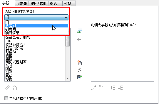 - 在“字段”选项卡上的“从下面选择可用字段”下拉列表中,选择“从房间”或“到房间”。