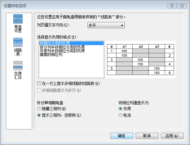 可以自定义配电盘明细表的外观。 可以指定常规外观的设置,以及线路信息和负荷汇总。