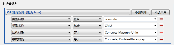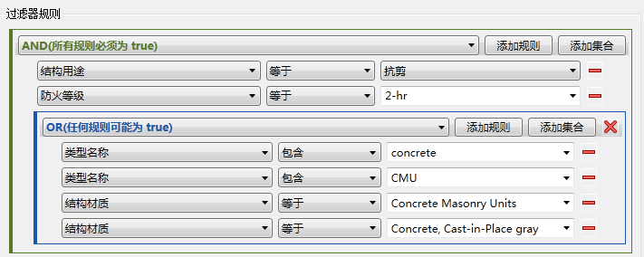 在此情况下,要识别该模型中所有拥有 2 小时防火等级并且由混凝土制成的剪力墙,您必须从 AND 规则集开始,并在其中嵌套 OR 规则集,如下所示: