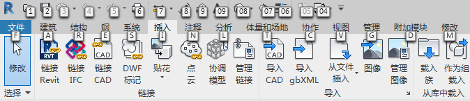 如果功能区选项卡带有包含附加工具的扩展面板,则在键入其按键提示后,将显示该面板以及那些工具的按键提示。