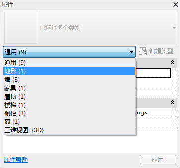 类型选择器的正下方是一个过滤器,该过滤器用来标识将由工具放置的图元类别,或者标识绘图区域中所选图元的类别和数量。 如果选择了多个类别或类型,则选项板上仅显示所有类别或类型所共有的实例属性。 当选择了多个类别时,使用过滤器的下拉列表可以仅查看特定类别或视图本身的属性。选择特定类别不会影响整个选择集。