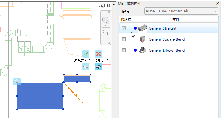 使用“修剪/延伸”、“快速连接”或“布线填充”来填充管道、风管或电气保护层的预制模型的间隙。