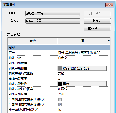 通过修改该轴网类型的“类型属性”来自定义轴线。