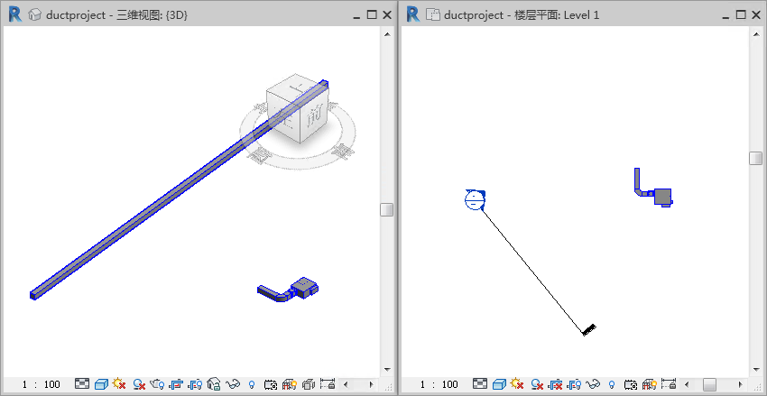 如果视图范围内没有可用连接件,风管将连接到视图平面与管段的相交处的 T 形三通。风管的中心线正好位于视图平面之上。