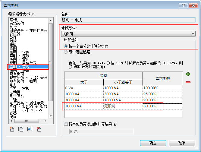 照明需求系数指定为按负荷计算,设置为按一个百分比计算总负荷。 如果负荷大于 10000VA,则需求系数为 80%。
