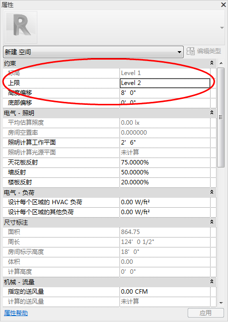 如果垂直长度超过房间边界图元(例如楼板或天花板),空间将捕捉到房间边界图元。 但是,拖曳控制柄和关联尺寸将指明指定的垂直长度,如下图所示。