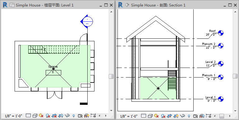 可以使用现有的剖面视图,但要确保剖面线与放置空间的区域相交。在下面示例中,只需要一个剖面视图,因为每个标高都包含了一个空间。您可能需要其他剖面视图,具体取决于设计的复杂度。