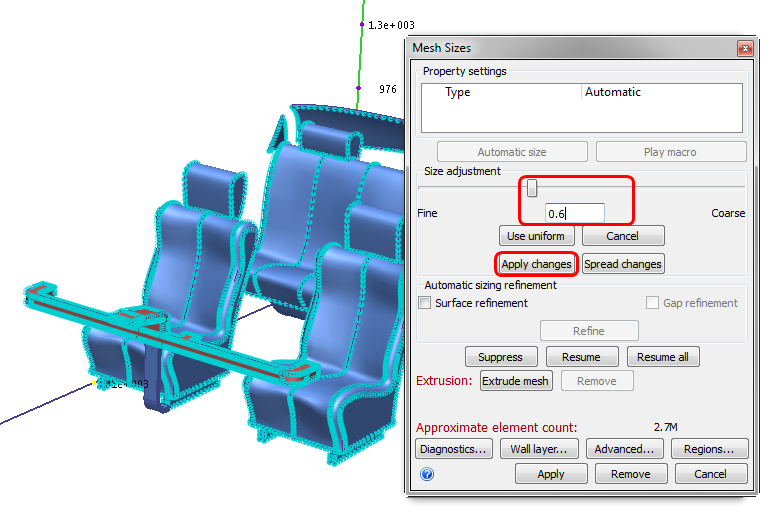 12. Select the cabin air part. In the Mesh Sizes dialog, drag the Size adjustment slider to approximately 2 (or type 2 in the field and press the Enter key). Click Apply changes.