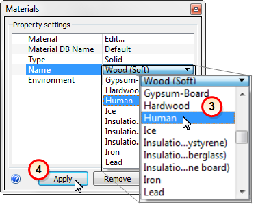 3. On the Materials quick edit dialog, verify the Type is Solid, and the Name is Human.