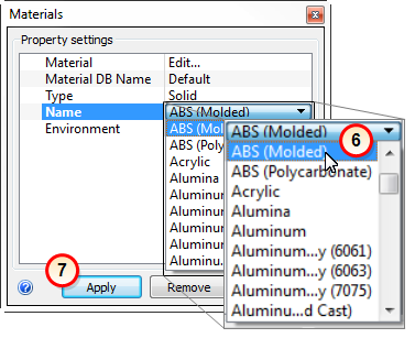 a. On the Design Study bar, confirm the material assignment for the ABS (Molded) parts.