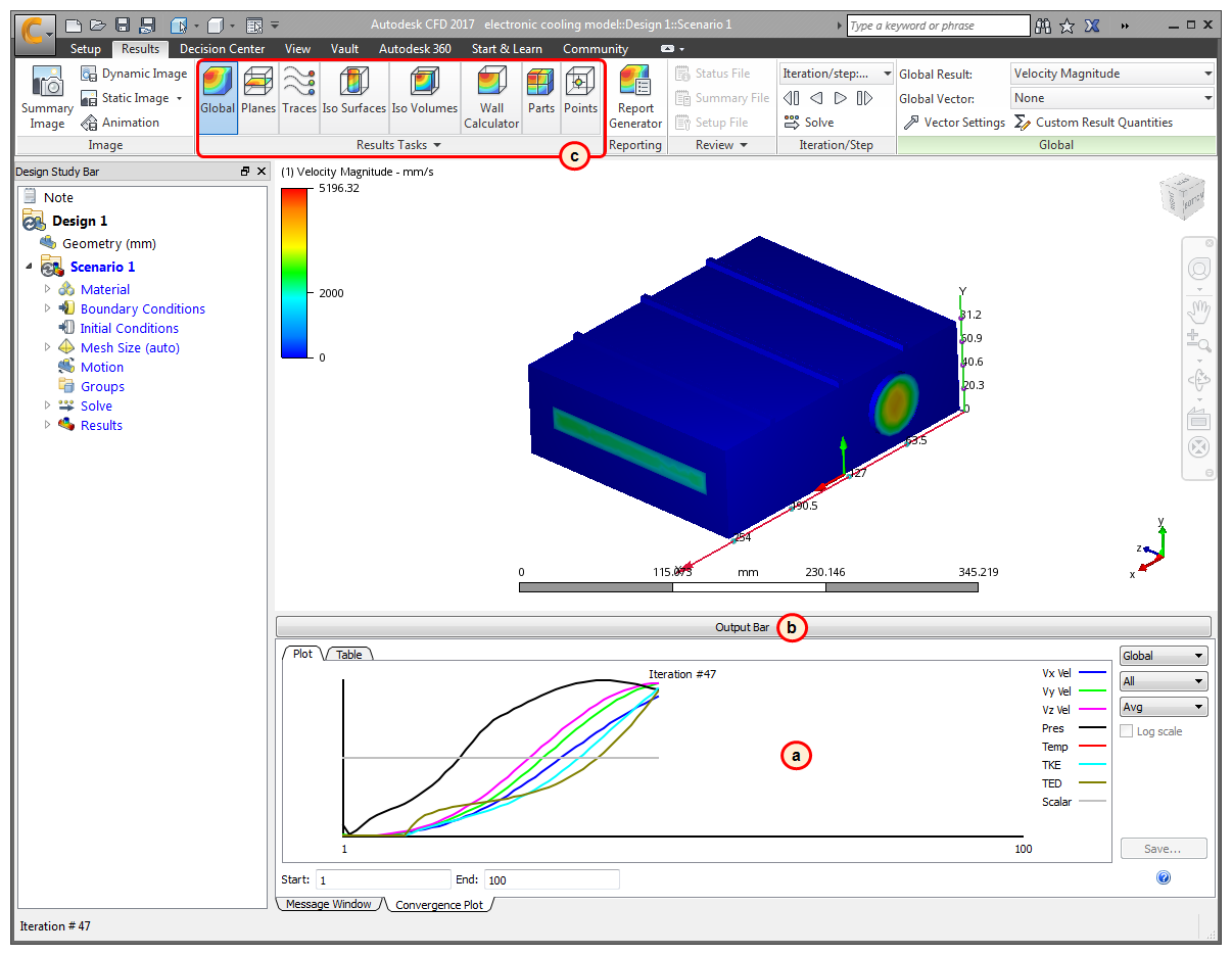 Note: For the first 100 iterations, the Temperature results do not change. Auto Forced Convection runs 100 flow-only iterations before solving for heat transfer. We can do this because the air moves fast enough to eliminate buoyancy effects. If buoyancy was relevant, we would solve flow and heat transfer together.