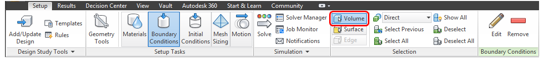 1. To change the selection mode, click Setup (tab) > Selection (panel) > Volume.