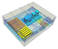Simulate air flow within an office enclosure. The model simulates a summer design day, so it's hot outside and we need to keep the occupant cool. |