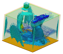 Simulate air flow and component temperatures in an electronics chassis. The enclosure contains PCBs, chips, and a fan to keep things cool. |