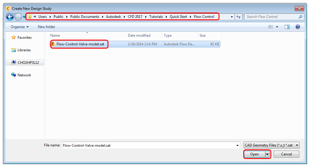 3. Navigate to C:\Users\Public\Public Documents\Autodesk\CFD 2018\Tutorials\Quick Start\Flow Control, and select Flow-Control-Valve-model.sat. Click Open.
