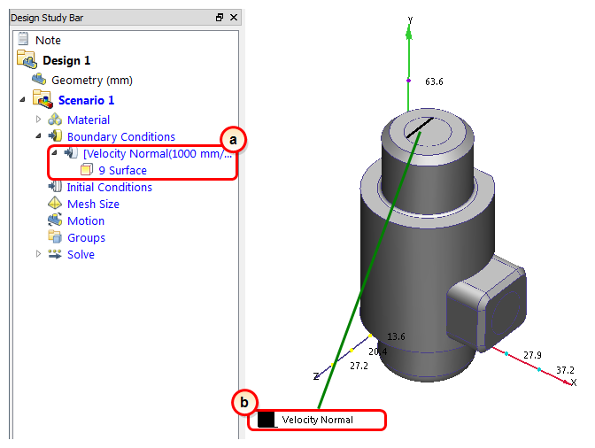 6. To verify that the boundary condition is properly assigned to the inlet, check the Design Study Bar and the colored stripe on the inlet surface: