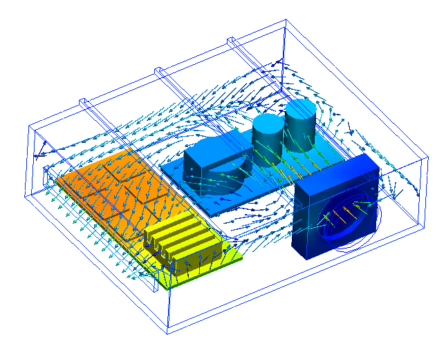In this tutorial, we model an electronics chassis to determine the component temperatures and the flow distribution. The enclosure consists of two PCBs, several chips, and a few other heat dissipating components. A commercially-available fan moves cooling air through the enclosure.