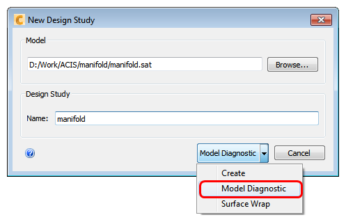 You can also activate the MAT when you import geometry directly into CFD without the use of a CAD application. Select the option for Model Diagnostic from the button menu, as shown in the following image. When this option is selected, your model opens into the MAT.