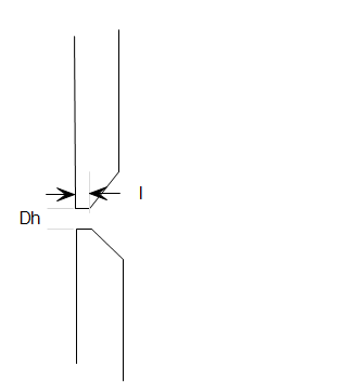 Note: This equation is valid for flow with Reynolds number greater than 105. The ratio of the flat portion of the hole length, l, to hydraulic diameter, Dh, is between 0 and 0.015: