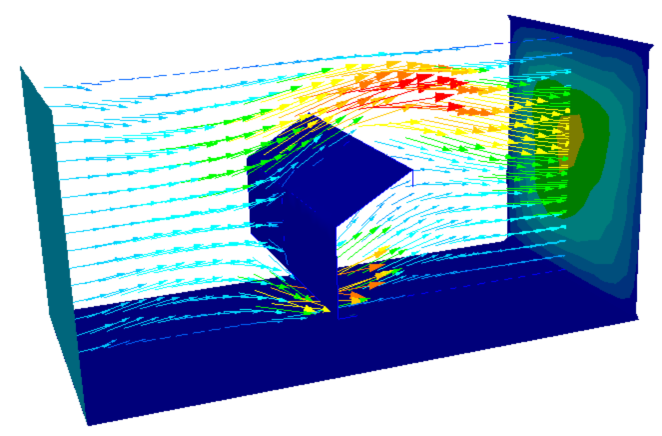 This model, however, uses a Surface Part to represent the thin obstruction. The element size on the surface part is not vastly different from that of the surrounding air, and the overall element count (model size) is considerably smaller (about 38,000 elements):