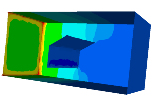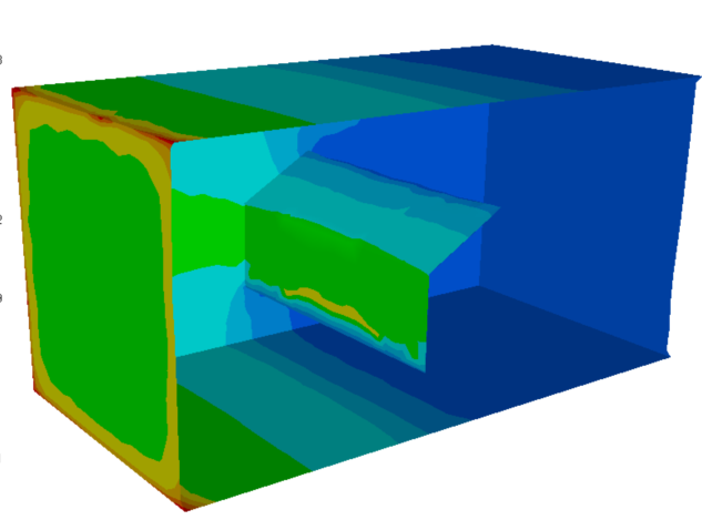 The following model contains a thin-walled obstruction that is modeled as a volume. The element size needed to represent this volume is quite small (because the part is so thin), so the element count is large (about 158,000 elements).