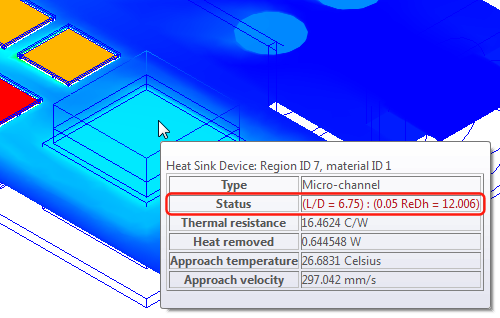 After your analysis, view results associated with your heat sink components to ensure that the heat sink material geometry and flow conditions are valid. Status = Normal operation indicates acceptable use of the heat sink material. Otherwise, the Status line provides information as to why the material is invalid for the operating conditions.
