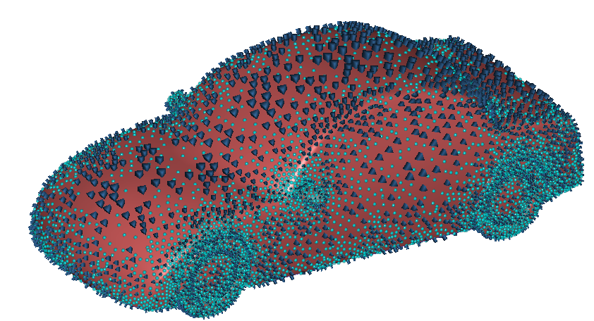 After clicking Autosize to define the mesh distribution on the model, cyan dots appear across the model. These represent an approximate mesh density. They do not indicate actual node locations. You can use these to determine where the mesh will be finer and where it will be coarser. In the following example, the mesh will be finer near the wheels. Along the doors, the mesh will be coarser.