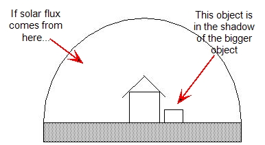The relative locations of objects in an analysis model are important because shadowing is computed by the Solar Heating model. When an object blocks solar flux (either partially or completely) from hitting another object, that blocked object is shadowed. Such an object is still subject to receiving indirect radiant heat flux from the sky, the ground, and surrounding objects.