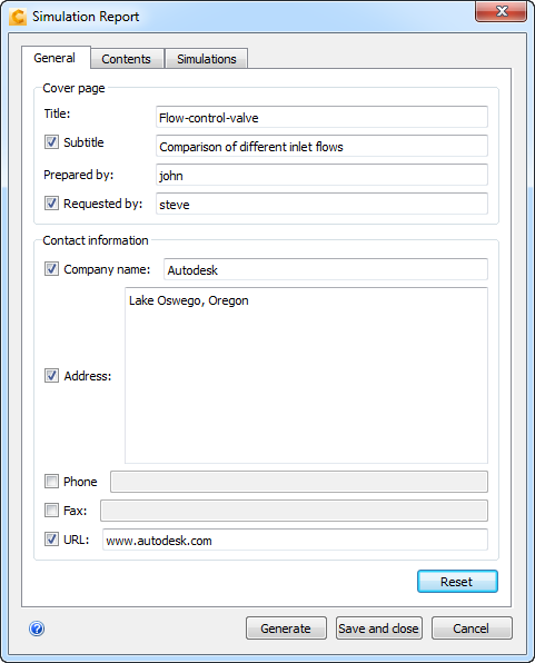 Your simulation is complete and now you want to share your findings. In the past, you would spend a significant amount of time and effort to compile needed information into a presentable format. Now, you can use Report Generator to customize and expedite the way you communicate results. Just populate the appropriate settings and input fields of the Simulation Report dialog and click Generate to output the information to a Microsoft Word document. Alternatively, if you want to delay creating your document, use Save and close to save your settings for future use. Click Reset to return all values to their defaults.