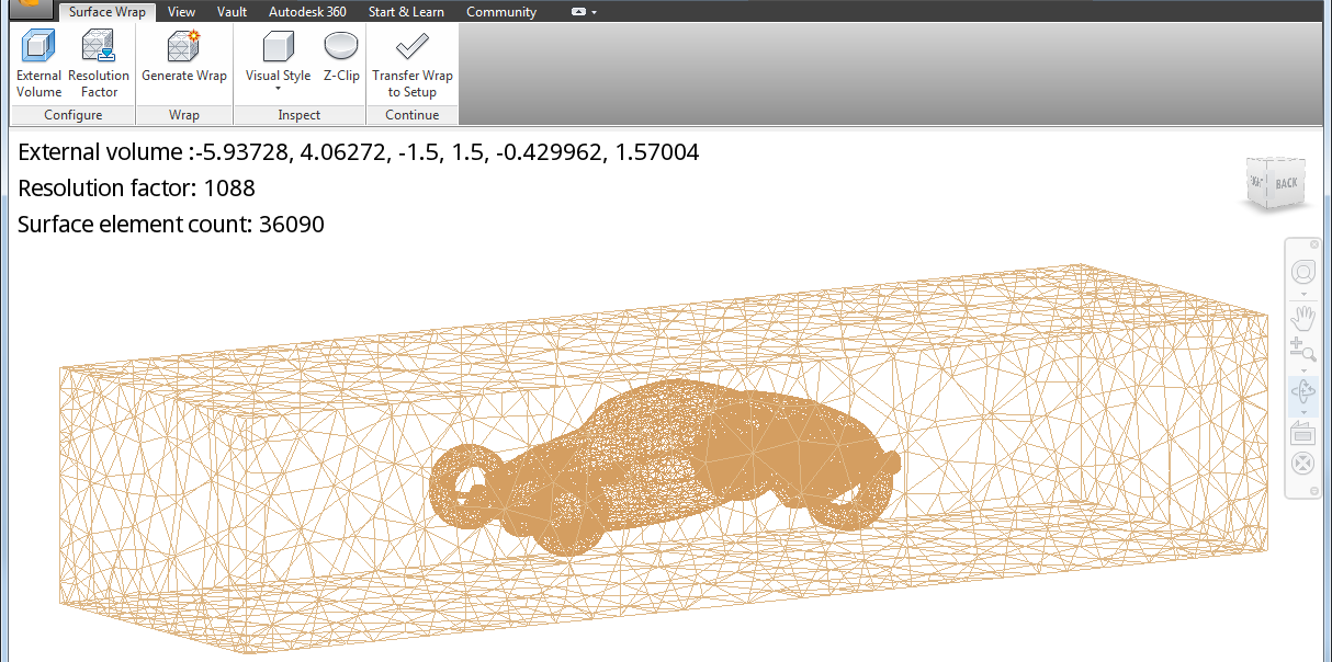 Use Autodesk® Surface Wrap to surface wrap a model, add an external volume, and generate a quality mesh for transfer into Autodesk® CFD. You can easily generate a mesh for CAD models that might otherwise be difficult or impossible to mesh without extensive CAD cleanup. Currently, Surface Wrap meshes are appropriate for external flow analyses or wind tunnel type models.