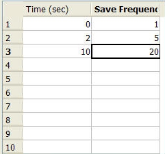 The table can be used to specify a save frequency based on time as well. When a time on the table is reached, the save frequency will change. For example, in the table shown below: