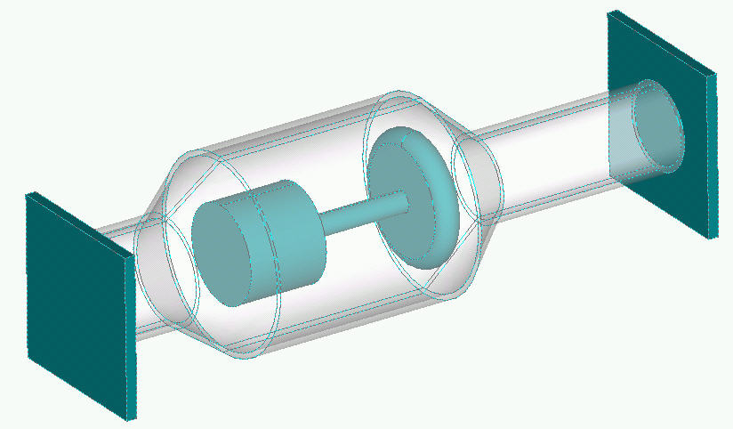 Step 2: Pipe geometry with newly-created volumes at the ends (pipe wall, poppet, and two end caps). The end caps were created by extruding the inner-radius curves of the pipe. This extends the flow volume slightly, but they can be suppressed from meshing if necessary.