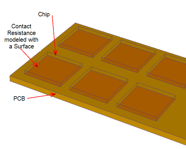 Surface Parts can be used to simulate thin layers of material between or within chip packages. Layers of epoxy or other substances are commonly used between thermal components, and the effect of their contact resistance must be included. A Surface Part material can be applied to a surface that represents an epoxy layer, eliminating the need to model the substance with a thin three dimensional volume. This approach will still account for the thermal conduction between the chip components, but will greatly simplify the modeling process and reduce the size of the mesh (analysis model size).