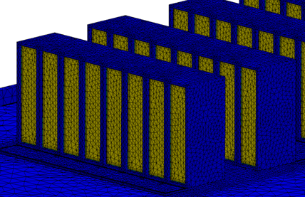 A refinement region in the center of the model enforces a uniform mesh density around all the server racks, giving us several nodes through their thickness and providing the mesh density needed for accurate flow and temperature prediction.