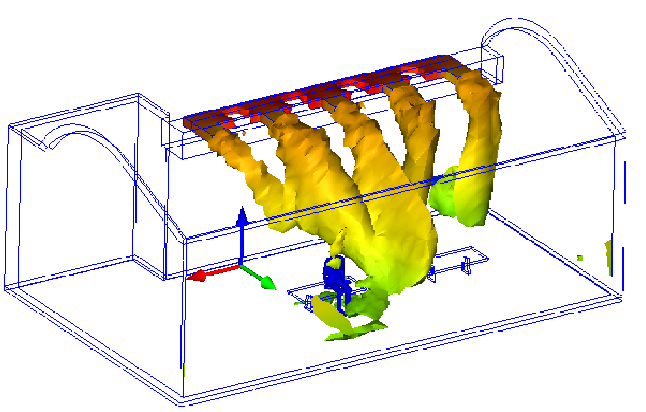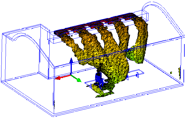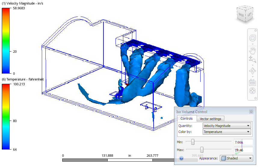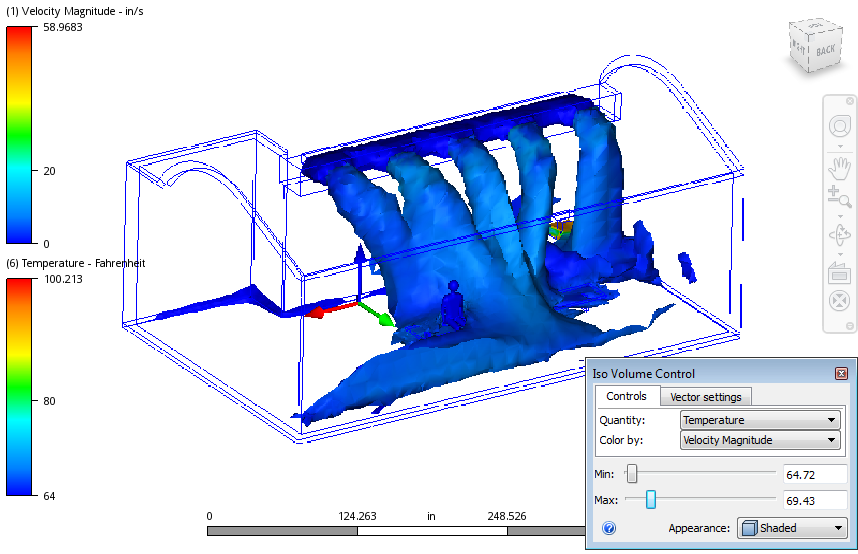 The following shows an velocity magnitude Iso Volume colored by temperature. The shape of the Iso Volume indicates everywhere in the model that falls within a specified range of velocity magnitude. The colors indicate the temperature.