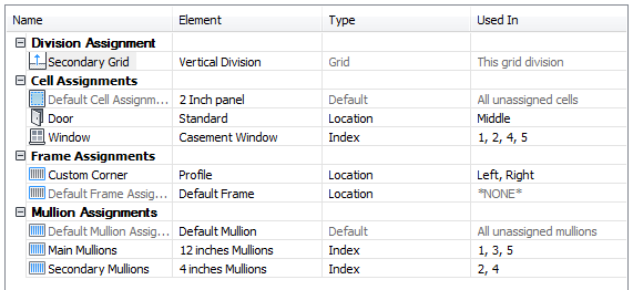 After you’ve created element definitions for a curtain wall style, you can assign those definitions to each of the curtain wall element types: divisions, cell infills, frames, and mullions.